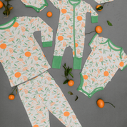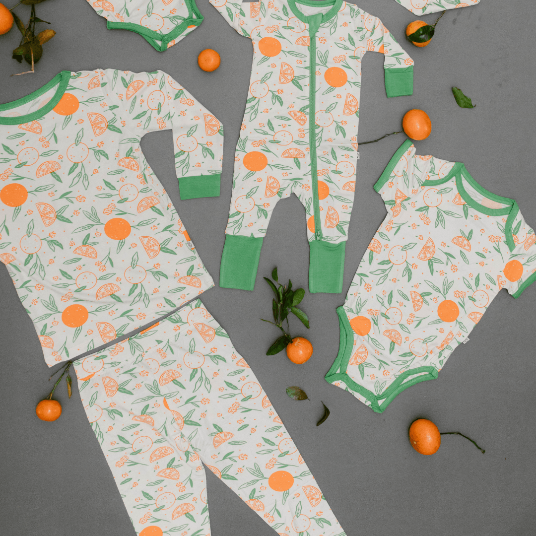 オレンジは、果樹園での日差しを浴びた午後を捉えた手描きのプリントです。シトラスと葉が、睡眠と遊びの両方に着用できる軽い生地に配置されています。