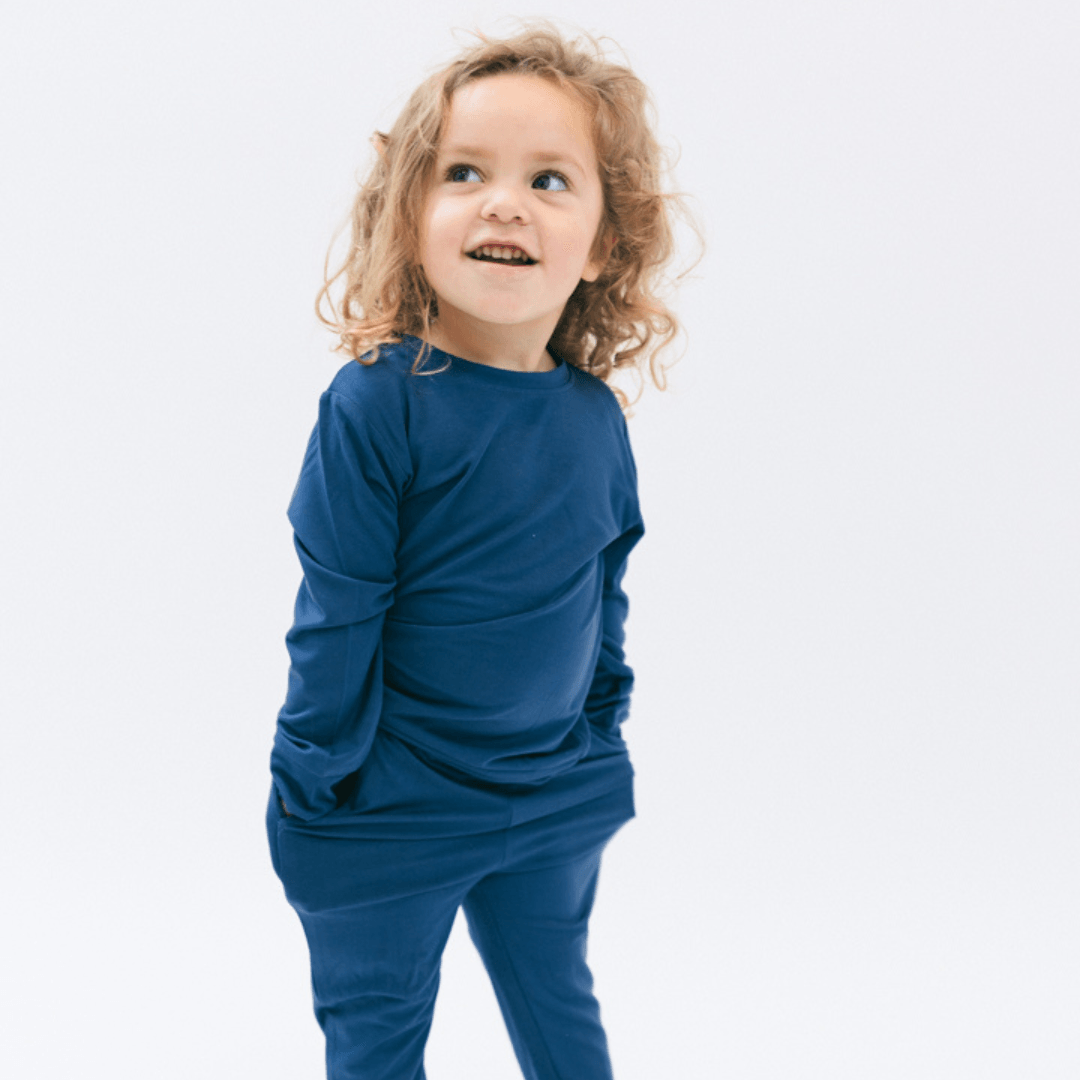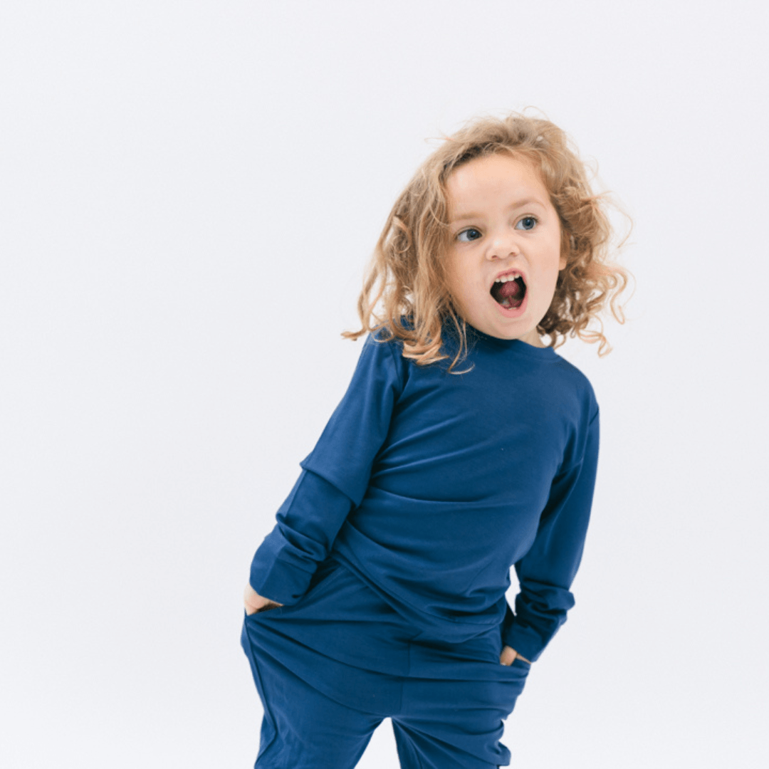Stormy Sky ass e déif bloe Stoff, deen all d' natierlech Eegeschaften vun Äre klenge Kanner betount. Subtil bold a ni méi langweileg.